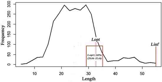 Length frequency distribution of the black pomfret shows the L∞, Lopt, and Lopt ± 10% of Lopt.