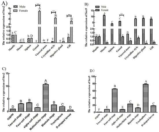 Lu, M.; Xing, Z.; Zhou, Y.; Xu, Y.; Peng, H.; Zou, J.; Dan, S.F.; She, Z.; Wang, P.; Liu, J.; et al. Cloning and Expression of Sox2 and Sox9 in Embryonic and Gonadal Development of Lutraria sieboldii. Fishes 2022, 7, 392. https://doi.org/10.3390/fishes7060392