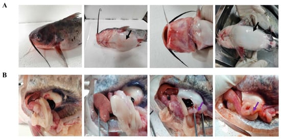 Natural features of A. veronii infection in channel catfish. The black arrow represents abdominal enlargement (A), and the purple arrows represent intussusception (B) in channel catfish.