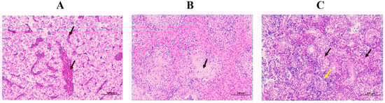 The following major histological changes were observed under the microscope (Figure 2): Liver (A): a small area of central vein and congestion in hepatic sinus (black arrow) can be seen at the edge of the liver tissue, and no other obvious abnormality was found. No apparent inflammatory cell infiltration was observed. Spleen (B): The parenchymal cells in the spleen tissue were reduced, the structure was necrotic (black arrows), and no other obvious abnormality was found. Kidney (C): there was a large amount of renal tubular necrosis, pyknosis, and fragmentation of the renal tubular epithelial cells, with disintegration and destruction of the original tissue structure (black arrow), and the yellow arrow points to hypertrophied glomeruli in renal tissue. No other evident abnormalities were found.