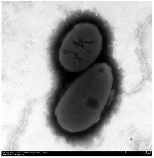 According to the Gram staining instructions, the morphological characteristics of the pathogenic bacteria were observed under a light microscope. To observe their ultra-structure, the purified bacteria were negatively stained with phosphotungstic acid (PTA), then observed with a transmission electron microscope at 80 kV (Hitachi-7650, Tokyo, Japan).