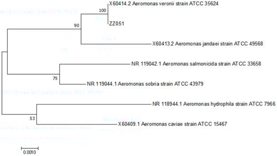 The BLAST analysis results of the 16s rRNA sequence showed that ZZ051 had a 100% identity to other A. veronii strains. The phylogenetic analysis was based on the comparison of the 16S rRNA sequences between isolate ZZ051 and other Aeromonas, including A. veronii (ATCC 35624), A. jandaei (ATCC 49568), A. salmonicida (ATCC 33658), A. sobria (ATCC 43979), A. hydrophila (ATCC 7966), and A. caviae (ATCC 15467). As demonstrated by the phylogenetic tree, isolate ZZ051 was clustered into one group with the reference A. veronii strain (Figure 5). The BLAST and phylogenetic analysis results confirmed the identification of the ZZ051 isolate as A. veronii.