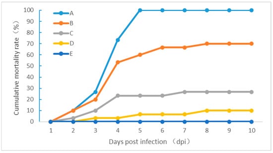 The pathogenicity of the isolate ZZ051 in healthy channel catfish experimentally infected with (A) 1 × 106, (B) 1 × 105, (C) 1 × 104, and (D) 1 × 103 CFU/fish. (E) Negative control.