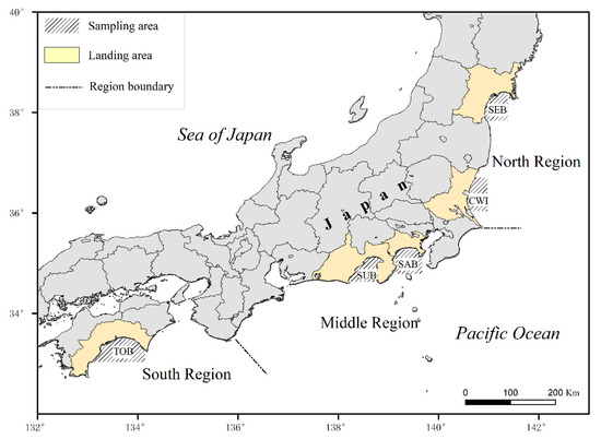 The anchovy larvae and juveniles used in this study were collected from bays or coastal waters off the Pacific coast of Japan’s five prefectures, across the Pacific North, Middle, and South fisheries regions (Ministry of Agriculture, Forestry and Fisheries of Japan; https://www.maff.go.jp/tokai/tokei/nenpo/68.html, accessed on 1 November 2022). Fish were obtained by commercial shirasu fishery, a local specialty fishery in Japan mainly for post-larvae and young juveniles of anchovy, sardine, and herring. Sampling (Table 1, Figure 1) was conducted thrice a month during the spawning season in Sendai Bay (SEB), coastal waters off Ibaraki Prefecture (CWI), Sagami Bay (SAB), Suruga Bay (SUB), and Tosa Bay (TOB). Single-boat trawling was employed in SEB and SAB, while two-boat trawling was employed in the other three areas. The samples were immediately frozen at −20 °C (for fish in SEB, CWI, SAB, and SUB) or preserved in 70% ethanol (for fish in TOB). Measurements of standard length (SL, to the nearest 0.01 mm) and body weight (BW, in g to 4 decimal places) were conducted for each individual fish in the laboratory. We calculated the original size and weight of alcohol-preserved fish individuals from the shrinkage rate obtained from a subsample of 175 individuals (Figures S1 and S2). Sagittal otoliths were extracted under a dissecting microscope, washed in alcohol, and mounted on glass slides with clear nail polish.