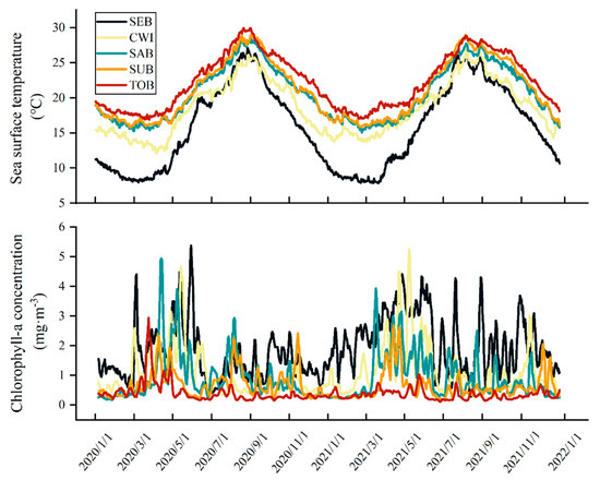 Daily sea surface temperature (upper) and five-day moving averaged chlorophyll-a concentration (lower) averaged over the broader sampling areas in 2020–2021.