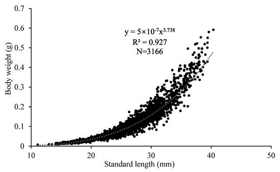 The relationship equation for body length and weight was established as BW = 5 × 10−7SL3.738 (Figure 4). The exponent b in the fitted equation for the LWR was significantly greater than 3 (Student’s t-test, p < 0.01), indicating strong positive allometric growth of anchovy during the study period.