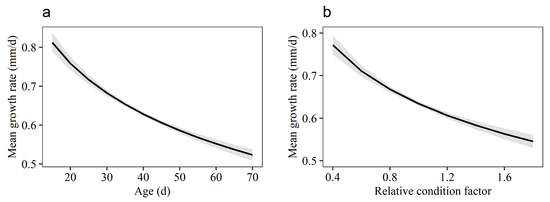 The difference in growth rates obtained from different ages is not easily attributable to environmental factors. Some studies have improved methods for distinguishing the inherent growth (which varies with age or body length) of fish from the influence of external factors. Shima et al. [67] eliminated age-dependent larval growth trends by fitting the growth models and obtaining residuals. Cordoleani et al. [68] used a specific growth rate rather than the absolute growth rate to remove the influence of body size on the growth of Chinook salmon (O. tshawytscha). A similar approach was applied in anchovy growth studies, and the growth rates were standardized to eliminate the effect of age in days [69]. Likewise, our study suggests that growth rate is age- or length-specific, and studies on the role of ambient factors directly on growth rate, without accounting for the variation in growth rates with age (inherent growth), can be prone to misperceptions.