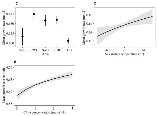 The global model containing all fixed effect variables was chosen as the optimal model, with the smallest AICc value and weighting dominantly among all possible models. The components that constitute the best endogenous effects were Age, Kn, and Area. As expected, the mean daily growth rate was generally negatively correlated with Age (Figure 5a, Table 3), indicating a decreasing trend in the daily growth rate during the studied age period. Meanwhile, there was a negative correlation between individual mean growth and Kn (Figure 5b, Table 3). An inherent difference was observed in the mean growth rate between the samples from the five areas. The optimal model predicted that the mean growth of fish varied across areas, with significantly higher growth for CWI, SAB, and SUB samples, and relatively lower growth for SEB and TOB samples (Figure 5c, Table S1). The optimal model showed that environmental factors SST and Chl-a were positively correlated with growth rate (Figure 5d,e, Table 3). The mixed-effects model explained more than 61% of the total variance of the data (conditional R2).
