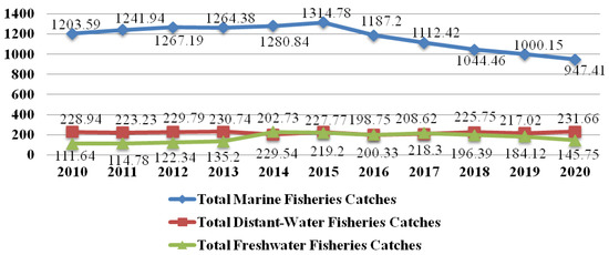63]. In terms of distant-water fisheries catches, and freshwater catches, the distant-water fisheries catches have shown a general fluctuating trend since 2013. However, the development of distant-water fishing was a practical approach emphasized by the Chinese government to address domestic demands, mitigate the supply imbalance of fishery products, and provide work for fishers [