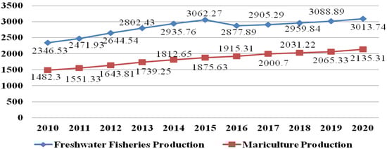 67]. However, the recent pandemic, habitat destruction, resource use conflicts, and biodiversity decline caused the total output of fisheries to decline in 2020. Although the freshwater fisheries production of 2020 also decreased slightly vis-à-vis 2019, the main development trend remained smooth (