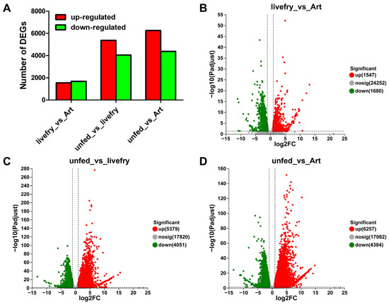The statistics of differentially expressed genes (DEGs). (A). The number of DEGs; (B). Volcano plot of DEGs between the mandarin fish larvae fed with live prey fish and brine shrimp; (C). Volcano plot of DEGs between the mandarin fish larvae unfed and fed with live prey fish; (D). Volcano plot of DEGs between the mandarin fish larvae unfed and fed with brine shrimp.