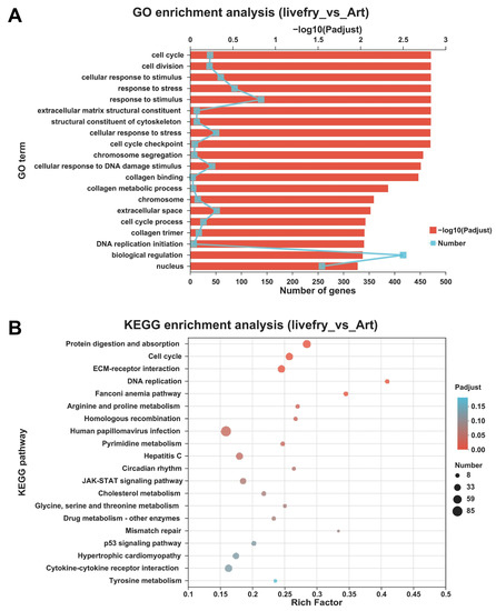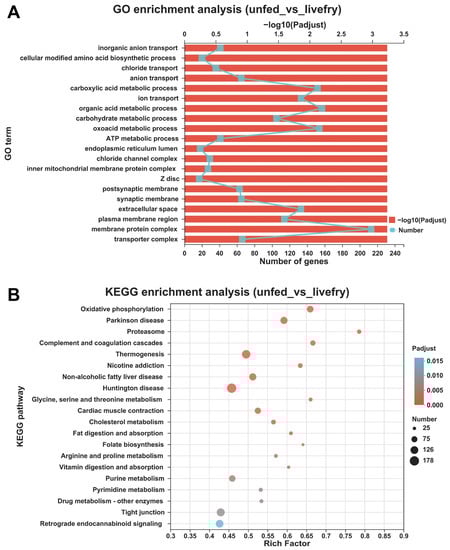 Functional enrichment analyses of DEGs between the mandarin fish larvae fed with live prey fish and brine shrimp. (A). Top 20 GO enrichment terms; (B). Top 20 KEGG enrichment pathways.