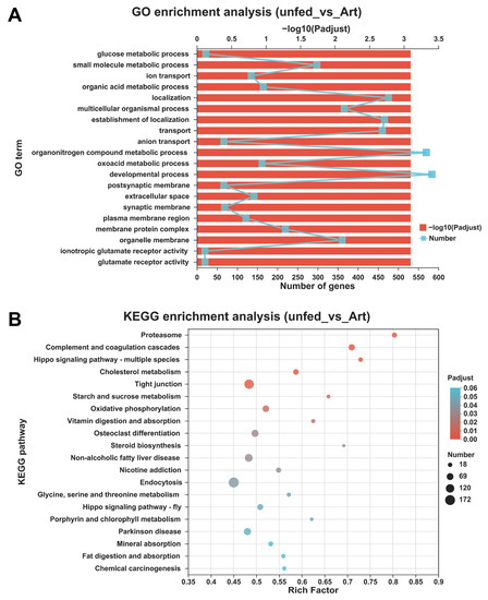 A total of 9430 DEGs were identified between the mandarin fish larvae unfed and fed with live prey fish. Compared with the unfed mandarin fish larvae, 5379 genes were up-regulated and 4051 genes were down-regulated in the mandarin fish larvae fed with live prey fish (Figure 1A,C). GO enrichment analysis revealed that these genes were significantly enriched in 309 GO items, including 171 GO terms in the biological process, 49 GO terms in the cellular component, and 89 GO terms in molecular function (Figure 3A, Supplementary Table S4). KEGG enrichment analysis revealed that these genes were significantly enriched in 25 KEGG pathways, including oxidative phosphorylation, proteasome, thermogenesis, nicotine addiction, glycine, serine and threonine metabolism, cholesterol metabolism, fat digestion and absorption, folate biosynthesis, arginine and proline metabolism, vitamin digestion and absorption, purine metabolism, pyrimidine metabolism, protein digestion and absorption, steroid biosynthesis, and glutathione metabolism (Figure 3B, Supplementary Table S5). Compared with the unfed mandarin fish larvae, try, prss, ctr, ctrl, cela, cpa, and cpb involved in protein digestion, cel involved in fat digestion, amy and lct involved in carbohydrate digestion were up-regulated in the mandarin fish larvae fed with live prey fish (Table 3).