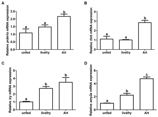 Experimental validation of DEGs by RT-qPCR. (A). PR domain zinc finger protein 1a (prdm1a); (B). thyroid hormone receptor beta (thrb); (C). pancreatic trypsin (try); (D). pancreatic alpha-amylase-like (amy2a). Data are represented as mean ± S.E.M. (n = 6). Data with different letters above the bars indicated significant differences (p < 0.05).