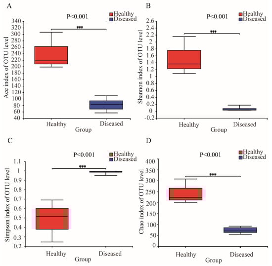 (A) Comparison of the Ace index of the bacterial communities in the healthy and diseased fish; (B) comparison of the Shannon index of the bacterial communities in the healthy and diseased fish; (C)comparison of the Simpson index of the bacterial communities in the healthy and diseased fish; (D)comparison of the Chao index of the bacterial communities in the healthy and diseased fish. Statistical significances between the two groups were considered at *** p < 0.001 by Student’s t test.