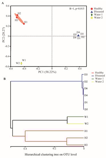Multivariate statistical analyses were conducted to compare the structure of bacterial communities in the gut and water. The ANOSIM revealed a significant difference (R = 0.86, p = 0.001) in the structure of bacterial communities among the three groups (healthy fish, diseased fish, and water samples) (Table 1). Further ANOSIM revealed significant differences (p < 0.05) in bacterial community structures between the diseased group and the healthy group, as well as the water sample group, but there was no significant difference (p > 0.05) between the healthy group and the water sample (Table 1). The principal coordinate analysis (PCoA) based on the Bray–Curtis distance algorithm was used to compare the bacterial community structures of healthy fish, diseased fish, and water samples. The PCoA plot showed that the bacterial communities among the samples from diseased fish were tightly clustered but were distinct from the clusters corresponding to the healthy fish and the water sample along PC1 (58.22% variation explained, Figure 2A). PCoA explained 86.50% variation in bacterial communities of all samples at two principal coordinates (Figure 2A). The hierarchical clustering tree on the OTU level disclosed that the bacterial communities in the healthy intestines clustered into one branch first and then clustered with the water samples, whereas the bacterial communities in the diseased intestines clustered together into another branch (Figure 2B). These results suggested that E. ictaluri infection caused significant changes in the gut microbiota structure of yellow catfish.