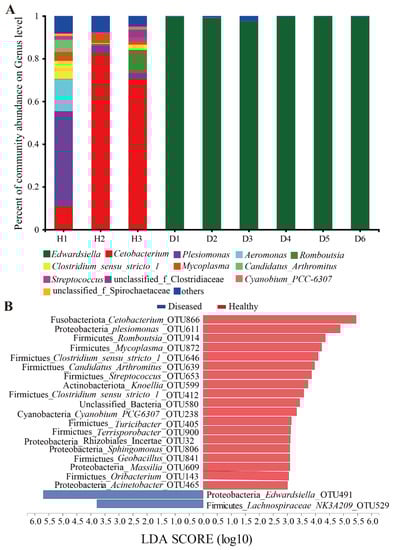 LEfSe analysis showed that a total of 19 OTUs were significantly higher in healthy fish, with Cetobacterium_OTU866, Plesiomonas_OTU611, Romboutsia_OTU914, and Mycoplasma_OTU872 being the most prominent. Conversely, only Edwardsiella_OTU491 and Lachnospiraceae_NK3A20_group_OTU529 were abundant in the diseased fish (LDA > 3, p < 0.05, Figure 3B).