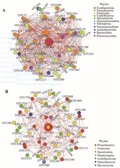 Networks of co-occurring bacterial OTUs of the healthy and diseased groups (Top 50% relative abundance). Only Spearman’s correlation coefficient (r > 0.4 or r < −0.4) is shown. The nodes are colored according to phyla. Red edges represent positive correlations, and blue edges represent negative correlations. Node size is the relative abundance of each OTU, and edge thickness is proportional to the weight of each correlation. (A) healthy group, (B) diseased group.
