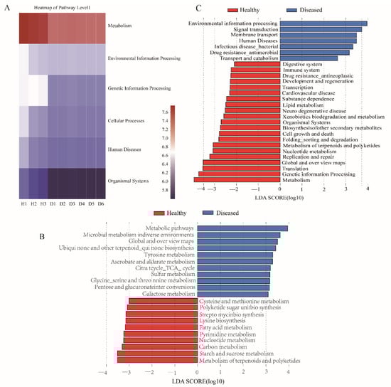 Differences in the predicted functions of the intestinal microbiota between the healthy and diseased groups. (A) Heatmap showing the main of pathway level 1. (B) LEfSe determined differences in metabolism of the intestinal microbiota between the healthy and diseased groups. (C) LEfSe determined differences in pathway level 2 of the intestinal microbiota between the healthy and diseased groups.