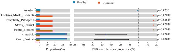 Differences in the predicted phenotypes of the intestinal microbiota between the healthy and diseased fish groups.