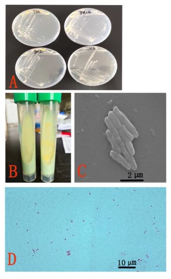 The isolated strain ZHLJ2019 from the liver, spleen, and kidney of diseased fish can grow on NA, TSA, BHIA, LJM and Middlebrook 7H10 agar after three days at 25 °C and proliferated faster on BHIA and Middlebrook 7H10 agar (Figure 2A,B). Bacterial colonies were milky white in the dark and yellow to orange when exposed to visible light, smooth, and had diameters of 1.5–2.5 mm. SEM analysis showed that the isolated strain ZHLJ2019 was a slightly curved amastigote with sizes of 2–3 μm × 0.4 μm (Figure 2C) and were positive for Z&N staining (Figure 2D).