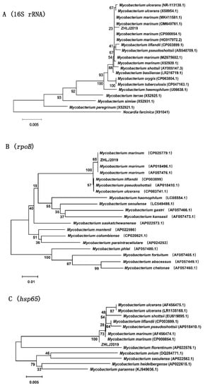 Five moderately variable genes, i.e., 16S rRNA, rpoB, hsp65, erp, and ITS, were found in all mycobacterial species and chosen for phylogenetic analysis in this work. The 16S rRNA gene consisting of highly conserved domains and variable regions throughout organisms, is considered the best target to determine phylogenetic relationships and is required for mycobacterial identification []. The rpoB gene has been used for molecular identification of intestinal bacteria, rickettsia, and spirochetes, including Borrelia spp. [,], and it has been strongly recommended as a molecular tool for the identification of mycobacteria due to its good power of discrimination [,]. The hsp65 gene, a single copy gene in the genome useful for differentiating the most closely related mycobacterial species or strains, is known to be more variable within the Mycobacterium genus than the 16S rRNA gene [,]. Given the large changes in sequence between M. ulcerans, M. pseudoshottsii, M. shottsii, and M. marinum, the erp gene is also used for species differentiation []. The ITS between 16S and 23S rRNA genes is considered a suitable probe target that can be used to obtain phylogenetic information []. On the basis of the phylogenetic tree of the 16S rRNA gene, we could infer that only the sequence of the 16S rRNA gene could not be discriminated at the species level due to high similarity among mycobacterial species. Although the hsp65, erp, and ITS genes of mycobacteria were reported to have better interspecies discrimination than the 16S rRNA gene [], ZHLJ2019 could not be separated from other mycobacteria and still clustered with M. ulcerans and M. pseudoshottsii type strains based on the phylogenetic trees constructed by the sequences of the hsp65, erp, and ITS genes. However, the phylogenetic tree based on the rpoB gene indicated that the ZHLJ2019 strain was assigned to M. marinum and clearly differentiated from other mycobacteria. Therefore, for the identification of clinical mycobacterial strains, the sequence analysis of multiple genes, in addition to the 16S rRNA gene, should also be combined with traditional phenotypic tests to improve discrimination and accuracy. In the present study, the strain ZHLJ2019 was identified as M. marinum based on morphological and biochemical characteristics and phylogenetic analyses of 16S rRNA, rpoB, hsp65, erp, and ITS genes.