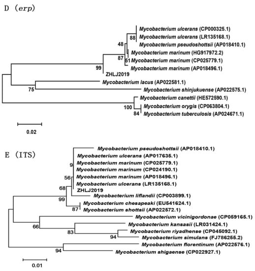 In this study, specialized physiological and biochemical experiments showed that Tween-80 hydrolysis and aromatic sulfatase reaction of the isolated strain ZHLJ2019 were positive, which was consistent with those of M. marinum but different from those of M. ulcerans, M. pseudoshottsii, and M. shottsii. However, morphological traits are no longer sufficient to distinguish between closely related mycobacterial species [,]. Combining phenotypic tests and genotypic approaches for mycobacterial identification is necessary to prevent false-negative results.