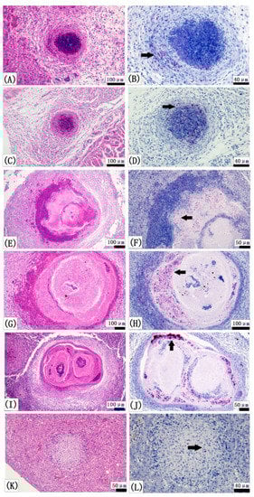 Histopathological examination revealed that the most classic histopathological feature was granulomatous inflammation in multiple tissues, such as the liver, heart, kidney, and spleen (Figure 4A,C,E,G). Granulomas were composed of concentric layers of epithelioid cells and frequently surrounded by a fibrotic capsule. Caseous necrosis and/or calcification of the central area of granulomas were also observed in the spleen and kidney tissues (Figure 4E–G). A large number of bacilli were seen in the center of granuloma at stage II of granulomas through Z&N staining (Figure 4B–D) and in the spindle cell layers of stage III granulomas. Occasionally, adjacent granulomas appeared to fuse and form a large multinodular lesion surrounded by continuous layers of spindle and epithelioid cells (Figure 4I,J).