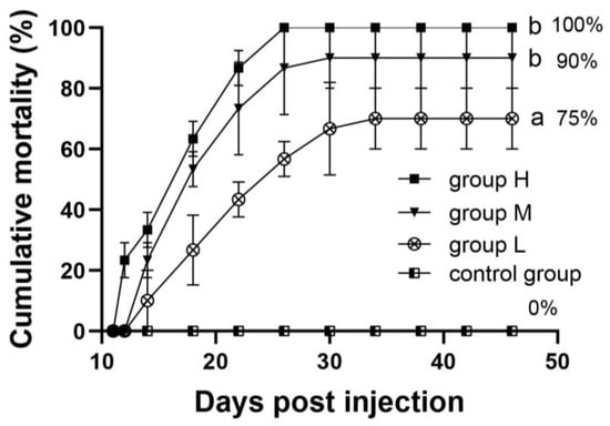 Cumulative percent mortality (%, mean ± SD) in Japanese seabass exposed to M. marinum and mock-injected control fish over a 6-week period. The concentrations of groups L, M, and H were 5 × 105, 5 × 106 and 5 × 107 CFU/mL, respectively. Significant differences (p < 0.05) are marked by different letters.