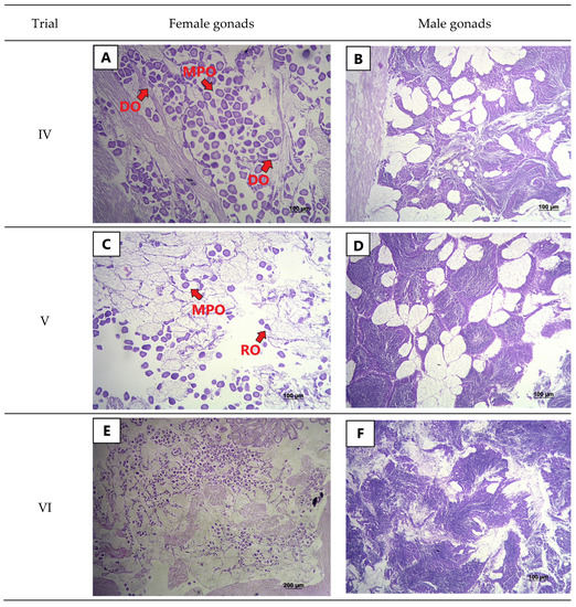 Histological analysis indicated that clams from trial IV were partially spawned (Figure 2A,B). There were mature, polygonal oocytes (MPO, Figure 2A) with empty spaces, deformed follicular walls with ruptures, as well as the presence of deteriorating oocytes (DO). No spermatic ducts were observed in the center of the follicle, the follicular walls present ruptures, and immature cells were also present in the walls (Figure 2B). In trial V, females were partially spawned, i.e., RO, MPO, and a few IO were present (Figure 2C). The males were also partially spawned, but the spermatozoa were not at the center, and the follicle center was quite empty in comparison to mature males (Figure 2D). Finally, gonads of females and males from trial VI were also in the partial spawning stage. The females had comparatively smaller follicles with a few polygonal oocytes, more rounded oocytes, and some oocytes undergoing deterioration (Figure 2E). The central region of the follicles of the males were partially empty with few spermatozoa (Figure 2F).