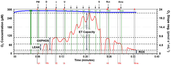 A substrate–uncoupler–inhibitor–titration (SUIT) protocol ideal for assessing oxidative phosphorylation with NADH-linked substrates (complex I) and S-pathway substrates (complex II) was used (SUIT-004 [