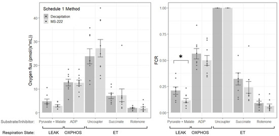 Although no significant differences were observed between the OXPHOS state and ET capacity with the substrate combinations tested, in the brain, FCR values for the MS-222 treatment group tended to be lower than the decapitated group. This suggests that mitochondrial respiration may be reduced when MS-222 is used during euthanasia. To confirm this, HRR measurements with additional individuals and alternative substrate combinations would be required, and further work could determine the precise mechanism of action of MS-222 on the ETS. The focus of the present study, however, was to determine whether MS-222 altered measurements made with HRR in fish to inform future work, and the findings here provide evidence that MS-222 may have an effect on respiration in mitochondria in the brain.