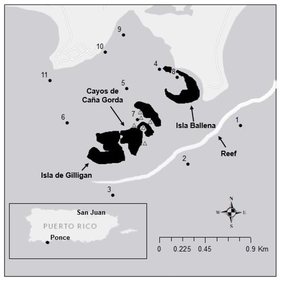 The study was conducted in the Guánica Biosphere Reserve (17°56′ N, 66°52′ W) (Figure 1). This UNESCO recognized site has minimal coastal development, and the majority of land area consists of natural vegetation (https://en.unesco.org/ (accessed on 01 December 2021)). The MSP seascape is located in and around station 7 adjacent to the two small mangrove keys (Gilligan’s Island and Isla Ballena) within the Cayos de Caña Gorda that are vegetated with red mangrove (Rhizophora mangle), seagrass, macroalgae, and patch reefs, typical of MSP seascapes in the Caribbean. The mangrove keys were separated by a deeper channel with a sand bottom and mixed stands of turtle grass (Thalassia testudinum), manatee grass (Syringodium filiforme) and shoal grass (Halodule wrightii). Large stands of turtle grass were also present on the leeward side of each mangrove key in the northwestern region of the seascape. The southeastern region of the seascape contained several small patch reefs, comprised primarily of mustard hill coral (Porites astreoides), hump coral or finger coral (P. porites), shallow-water starlet coral (Siderastrea radians) and the round starlet coral (S. sidereal). In addition, a variety of macroalgae (Table S1) were present throughout the MSP seascape; given they represent a small fraction of the total primary producer biomass they were not included in the MixSIAR. Across the study area, salinities (36–38 psu) and temperatures (26 ± 2 °C) were similar during the sampling campaign (data not shown).