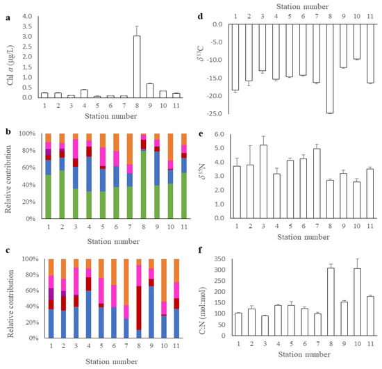 At each of the 11 sampling stations, replicate samples were collected to measure (a) Chlorophyll (chl) a (µg L−1); (b) HPLC pigment analysis of the phytoplankton community with chlorophytes (green), cyanobacteria (blue), dinoflagellates (red), cryptophytes (pink), haptophytes (purple) and diatoms (orange); and (c) HPLC pigment analysis minus the chlorophytes. Simultaneously, we sampled replicates to determine the (d) δ13C; (e) δ15N; and (f) C:N (mol:mol) of phytoplankton at each of the stations.