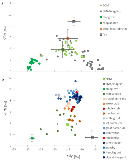 Stable isotope biplots displaying individual δ13C and δ15N values for the POM, BMA/seagrass and red mangrove (circles) summarized the major sources of primary producers supporting invertebrate and fish consumers (squares) in the MSP seascape (Figure 4a). Mean (±SD) δ13C and δ15N values for zooplankton and other invertebrates (see MixSIAR analysis) show that these communities rely on POM and BMA/seagrasses as a food source to invertebrates and fishes (squares), but for the most part little from the red mangrove. Similarly. an isotope biplot displaying individual δ13C and δ15N values for the four benthic invertebrates and nine fish species (circles) used in the MixSIAR analysis (Figure 4b) reveals which members of the community are utilizing the POM, BMA/seagrass and red mangrove (mean (±SD) δ13C and δ15N values; squares).