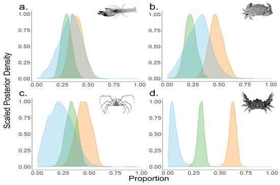 Relative contribution estimates of the three dominant primary producers [POM (blue), BMA/seagrass (orange), mangrove (green)] for the four most prevalent invertebrate species. Plots represent outputs from MixSIAR models. Invertebrate species are (a) snapping shrimp, (b) rubble crab, (c) arrow crab, and (d) clinging crab.