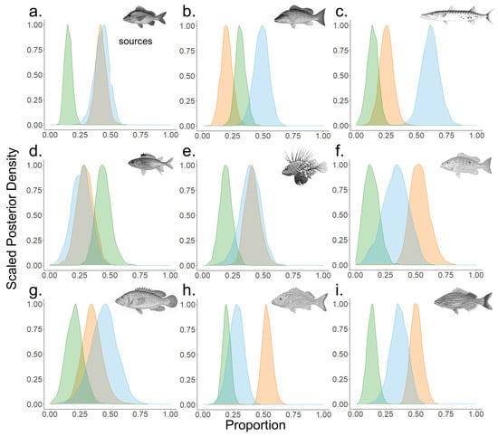 Consumers (Table 1 and Table S1) were collected from the MSP seascape (Figure 1) using a variety of gear types. Gears included a 30 m length x 1 m height seine net, pole spears, and manually collecting benthic invertebrates by hand. Muscle tissue from consumers was dissected and frozen at −20 °C as described in [18]. Based on size and other characteristics (color and markings), all fishes selected for MixSIAR were assumed to be juveniles or sub-adults.