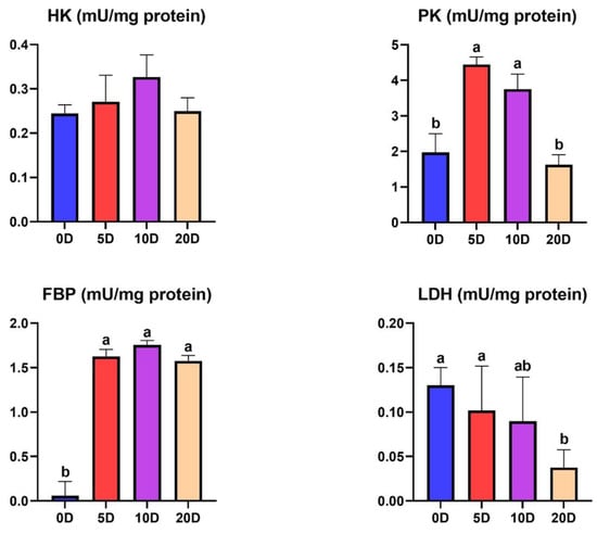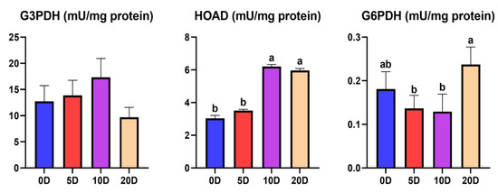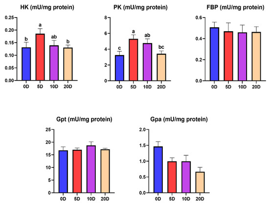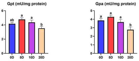 The results of the enzyme activities involved in the glycogenolysis pathway in the liver are shown in Figure 6. The 20 D fish presented a significantly lower enzyme activity of GPt than 5 D and 10 D. The GPa was significantly lower in the 20 D fish than the rest of the treatments.