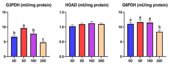The response to different fasting periods of enzyme muscle activity related to lipid metabolism is shown in Figure 3. HOAD enzyme activity was higher in the 10 D and 20 D fish than the other groups. The 20 D fish presented a higher G6PDH enzyme activity than 5 D and 10 D, but no significant differences between treatments were found in the G3PDH and HOAD enzyme activities.