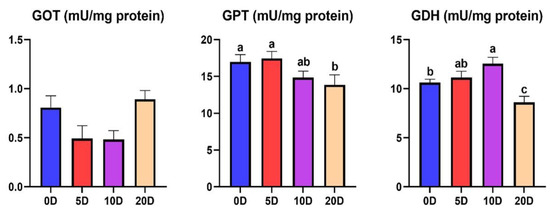 The GOT enzyme activity in muscle was significantly higher in 5 D fish than 0 D and 10 D. The 5 D and 10 D fish presented a significantly lower enzyme activity of GDH in muscle than 0 D. No significant differences due to fasting times were found in the GPt enzyme activity in muscle (Figure 4).