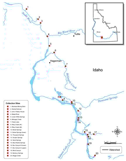 Groundwater-fed springs often provide unique environments that support endemic species of plants and animals. Some of the largest springs in the United States are found along the Snake River Canyon in south central Idaho []. The water from these springs originates in the mountains of the Lost River Basin where it flows in a southerly direction before disappearing underground into the state’s largest aquifer. After traveling ~160 km south, through porous basalt lava flows, this water returns to the surface along the canyon walls of the Thousand Springs formation before entering the Snake River. This region of springs is constricted to a ~64 km area within the Hagerman Valley, Idaho. The springs have been heavily developed for irrigation and aquaculture []. The remaining unaltered springs are characterized by clear, well oxygenated water, and uniform year-round temperatures (14 °C–16 °C) that support a variety of specialist plant and animal species, including three endemic freshwater snail species that are federally protected under the United States Endangered Species Act (ESA) [].