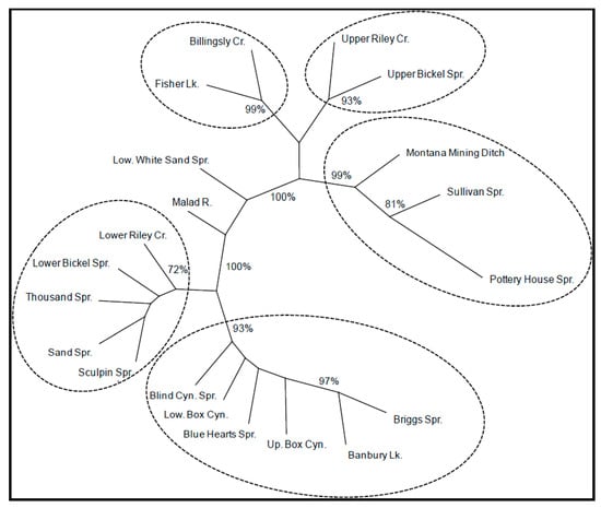 Neighbor-joining dendrogram showing genetic relationships among Shoshone Sculpin populations based on genetic chord distances []. Bootstrap values are reported as percentages of the total and were listed only if they exceeded 70%.