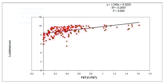 To test whether genetic differentiation between collection sites was associated with geographic distance, a Mantel’s test [] was performed from the comparison of population pairwise FST/(1-FST) values against population pairwise straight line geographical distances (Ln) using the program ISOLDE in GENEPOP.