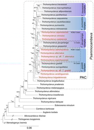 Terminal taxa comprised 22 terminal taxa, which represented all species of PAC, including the five new species. Outgroups comprised three species of Psammocambeva representing other subgeneric lineages, four species of Trichomycterus representing other subgenera, two species representing the clade comprising Cambeva Katz, Barbosa, Mattos and Costa, 2018 plus Scleronema Eigenmann, 1917, the sister group of Trichomycterus []; one trichomycterine species representing another subfamilial lineage; two species representing other trichomycterid subfamilies; and one nematogenyid species, a basal representative of loricarioid catfishes. Separate gene datasets (COX1 521 bp, CYTB 1088 bp, RAG2 821 bp, ND4 692 bp, MYH6 543 bp) were aligned using the Clustal W algorithm [] implemented in MEGA 11.No gaps or stop codons were found. The PartitionFinder 2.1.1 (Canberra, ACT, Australia) [] algorithm was used to calculate the optimal partition scheme and best-fit evolutive models based on the Corrected Akaike Information Criterion (Appendix B). Two independent approaches for phylogenetic reconstruction were performed for the concatenated molecular data matrix (3665 bp): Bayesian Inference, using MrBayes 3.2.7a [] (two independent Markov chain Monte Carlo (MCMC) runs with 5 × 107 generations, with a sampling frequency of every 1000 generations; convergence of the MCMC chains, attainment of the stationary phase, effective sample size adequacy, and determination of the burn-in percentage evaluated using Tracer 1.7.2 (Auckland, Aukland Region, New Zeland) []; and the majority-rule consensus of saved trees and Bayesian posterior probabilities calculated applying a 25% burn-in) and Maximum Likelihood, using GARLI 2.0 (Lawrence, KS, USA) [], with branch support assessed using the values of the majority-rule consensus tree calculated with 1000 nonparametric bootstrap replicates [].