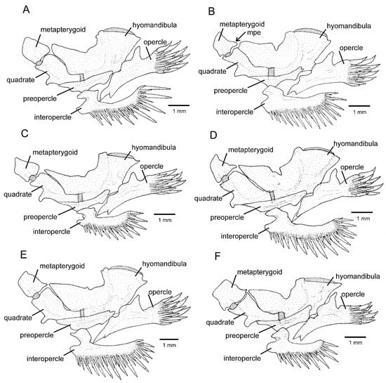 Left jaw suspensorium and opercular series, lateral view: (A) Trichomycterus brigadeirensis Costa, Katz and Vilardo sp. nov.; (B) Trichomycterus caratinguensis Costa, Katz and Vilardo sp. nov.; (C) Trichomycterus espinhacensis Costa and Katz sp. nov.; (D) Trichomycterus caparaoensis Costa, Barbosa and Katz sp. nov.; (E) Trichomycterus castelensis Costa, Katz and Vilardo sp. nov.; (F) Trichomycterus vinnulus. mpe: metapterygoid posterior extension. Larger stippling represents cartilage.