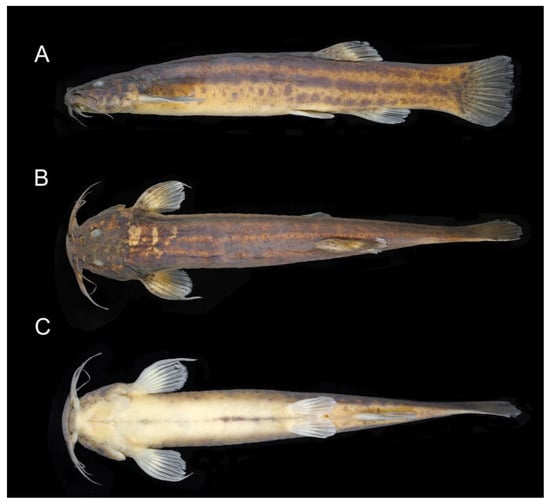Trichomcyterus sp. aff. T. goeldii, UFRJ 13107, Serro Municipality, 43.1 mm SL: (A) lateral, (B) dorsal, and (C) ventral views.
