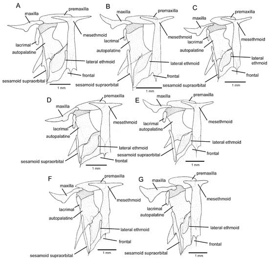 Mesethmoidal region, middle and left portions, dorsal view: (A) Trichomycterus brigadeirensis Costa, Katz and Vilardo sp. nov.; (B) Trichomycterus caratinguensis Costa, Katz and Vilardo sp. nov.; (C) Trichomycterus espinhacensis Costa and Katz sp. nov.; (D) Trichomycterus caparaoensis Costa, Barbosa and Katz sp. nov.; (E) Trichomycterus castelensis Costa, Katz and Vilardo sp. nov.; (F) Trichomycterus vinnulus; (G) Trichomycterus astromycterus. Larger stippling represents cartilage.