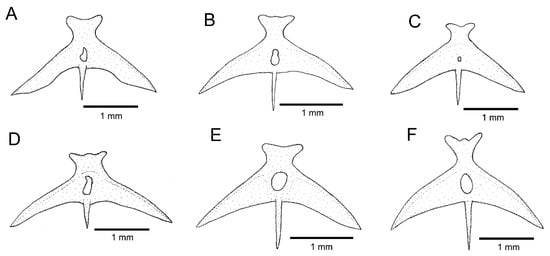 Parurohyal, ventral view: (A) Trichomycterus brigadeirensis Costa, Katz and Vilardo sp. nov.; (B) Trichomycterus caratinguensis Costa, Katz and Vilardo sp. nov.; (C) Trichomycterus espinhacensis Costa and Katz sp. nov.; (D) Trichomycterus caparaoensis Costa, Barbosa and Katz sp. nov.; (E) Trichomycterus castelensis Costa, Katz and Vilardo sp. nov.; (F) Trichomycterus vinnulus.