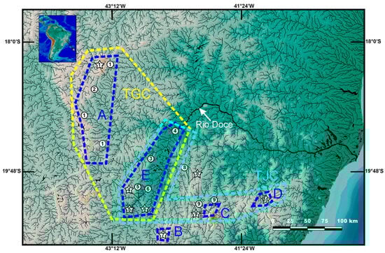- Giulietti, A.M.; Pirani, J.R.; Harley, R.M. Espinhaço Range region, eastern Brazil. In Centres of Plant Diversity: A Guide and Strategy for Their Conservation; Davis, S.D., Heywood, V.H., Herrera-Macbryde, O., Villa-Lobos, J., Hamilton, A.C., Eds.; IUCN Publication Unit: Cambridge, UK, 1997; pp. 397–404. [Google Scholar]