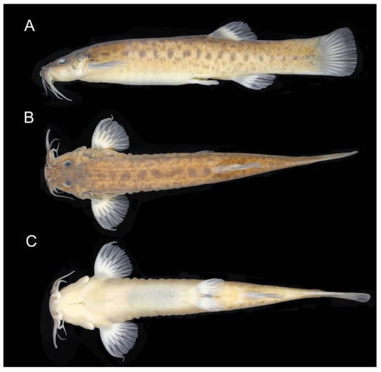 Colouration in alcohol (Figure 10): The ground colour of the dorsum, flank and head side is light brownish yellow on the dorsal part, gradually becoming lighter ventrally. Flank and dorsum with variably shaped small pale brown spots, their diameter approximately equal, slightly larger or slightly smaller than opercular patch of odontodes. LDPZ 1 spots sometimes longitudinally coalesced to form a stripe, sometimes transversely coalesced with LDPZ 2 spots. LDPZ 3 usually has round spots forming regular series, sometimes irregularly arranged and irregularly shaped. LDPZ 4 with paler spots. Dark chromatophores are scattered over the dorsal portion of the head and dorsal part of the trunk. Head with small light brown dots. Venter white. Nasal and maxillary barbels light brown, rictal barbel light grey. Fins hyaline, with dark brown chromatophores on the basal portion.